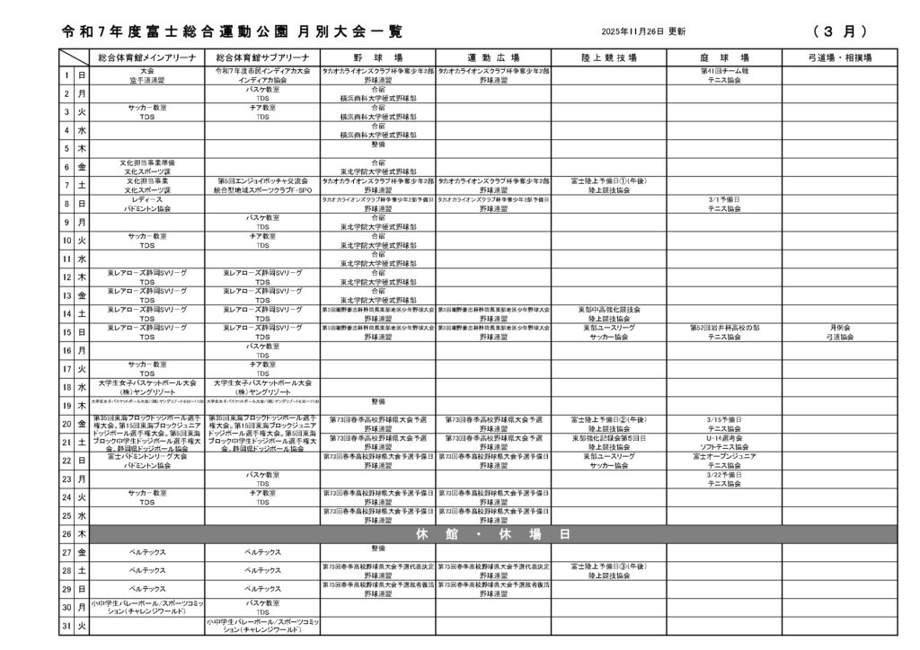 お知らせ news 富士総合運動公園HOME お知らせ 令和7年度3月イベントカレンダー 令和7年度3月イベントカレンダー 2026.01.17 毎月第4木曜日(3月26日)は休館・休場日となります。 お知らせ一覧へ戻る