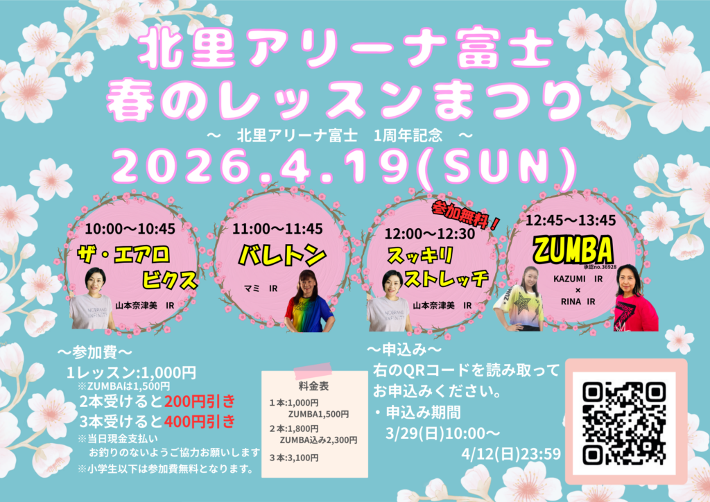 お知らせ news 富士総合運動公園HOME お知らせ 2026年4月19日(日)北里アリーナ富士 一周年記念 春のレッスンまつり 2026年4月19日(日)北里アリーナ富士 一周年記念 春のレッスンまつり 2026.03.05 お知らせ一覧へ戻る