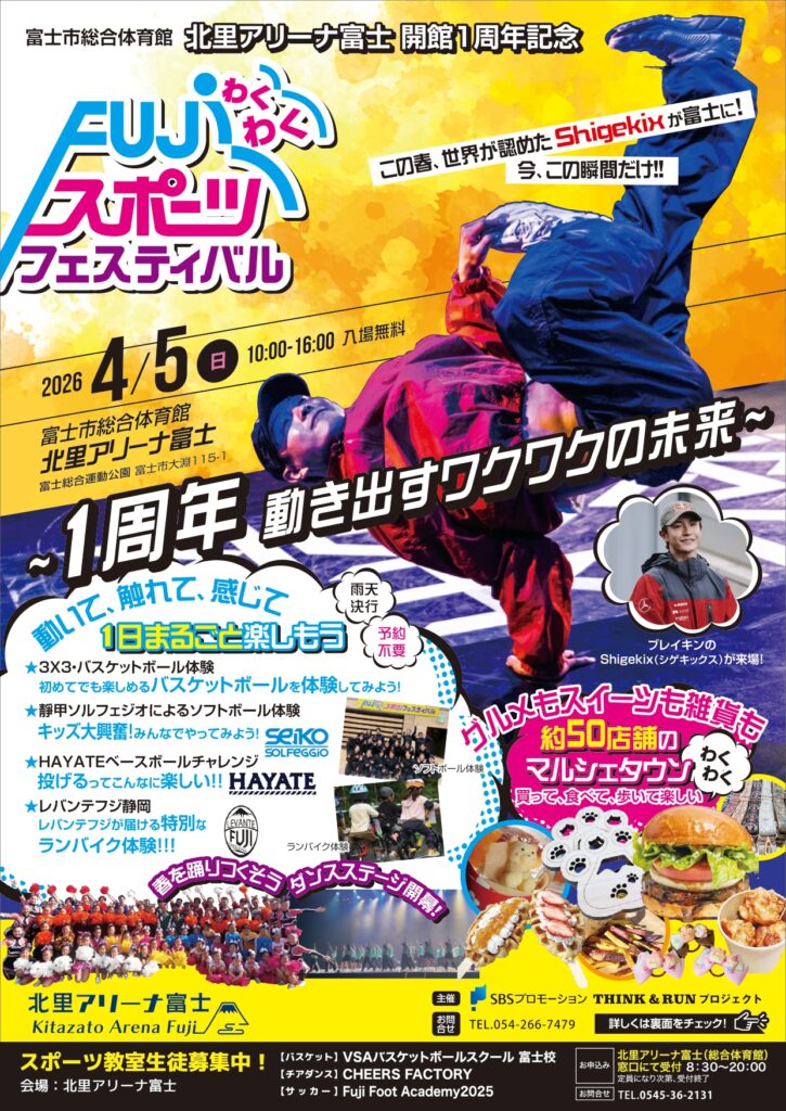 お知らせ news 富士総合運動公園HOME お知らせ 2026年4月5日(日)北里アリーナ富士(富士市総合体育館)開館一周年記念FUJIわくわくポーツフェスティバル 2026年4月5日(日)北里アリーナ富士(富士市総合体育館)開館一周年記念FUJIわくわくポーツフェスティバル 2026.03.17 お知らせ一覧へ戻る